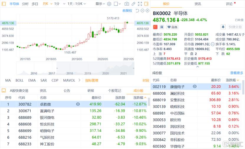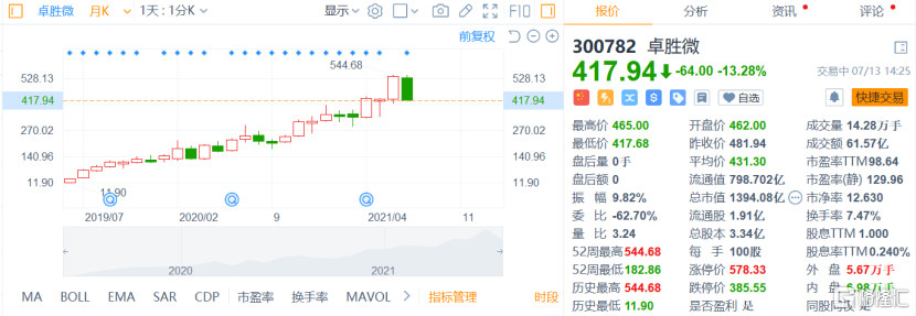 不过最惨的还是位于板块跌幅榜首的卓胜微,开盘之后快速下挫,收盘暴跌12.87%。尤其是进入7月以来卓胜微股价跌多涨少,如果从6月30日的最高价544计算,7月卓胜微8天逆势下跌21%,不可谓不惨烈。