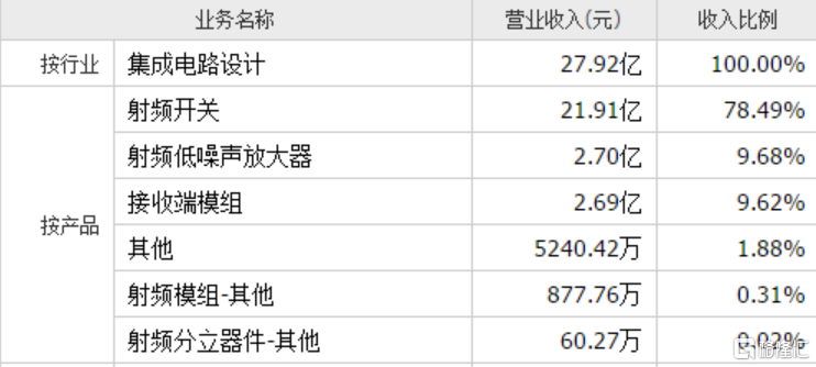分析卓胜微的营收可以发现,2020年实现28个“小目标”的收入中,大部分营收却是射频开关贡献的,占比达到78%左右,表明营收结构非常单一。