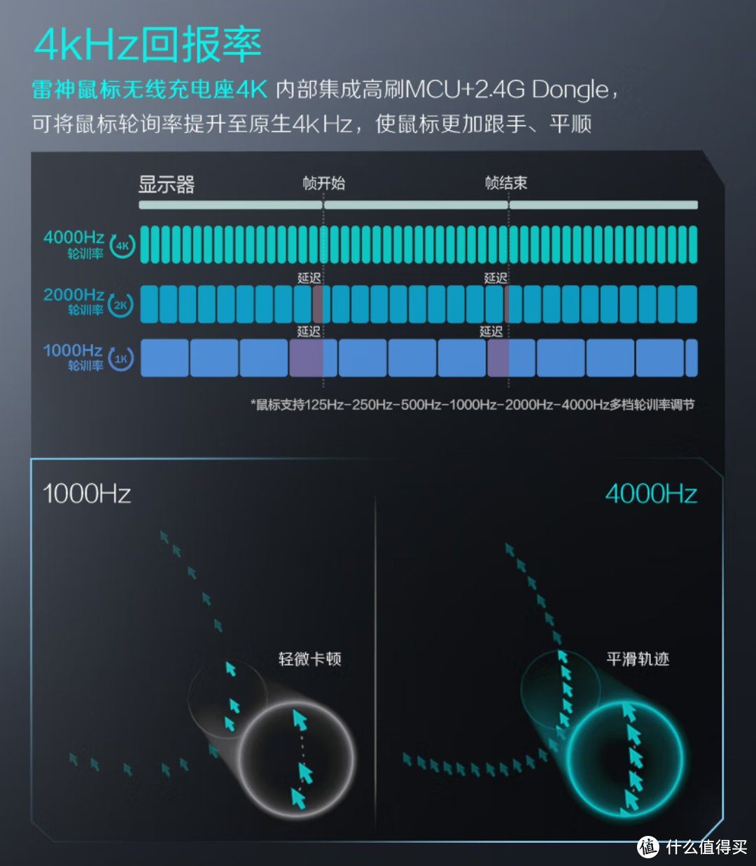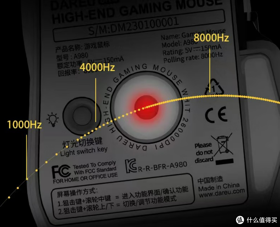 值得一提的是,A980 为如今唯一一款支持 8KHz 回报率的国产游戏鼠标,回报率越高鼠标的位移越平滑精准,但需要占用不小的 CPU 性能。目前绝大部分游戏鼠标都支持的是 1KHz 回报率,不过这其实也完全够用了,更高的 4KHz、8KHz 提升边界效应明显,对于性能不强的电脑甚至是 debuff,适合有极致性能追求的玩家搭配高性能电脑和高刷显示屏使用。