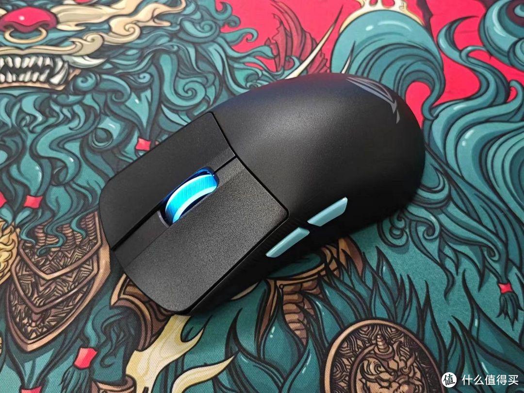 得益于高强度低密度的 PA11 尼龙外壳,龙鳞在做到 54g 轻量化的同时仍然保持着非常高的外壳强度,非国产轻量化鼠标通过做薄外壳来减少重量所能比拟,ROG 还在鼠标滚轮处设计了 RGB 滚轮灯,是目前 60g 以内轻量化无线鼠标中唯一一款有灯效的。