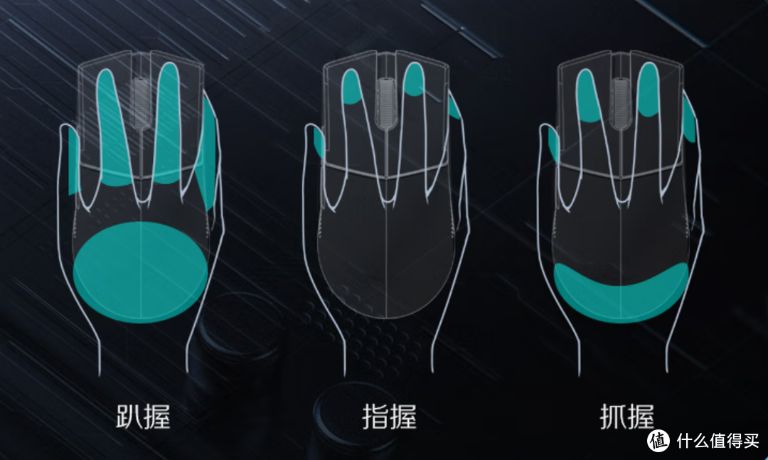 趴握为手指手掌大面积贴合鼠背,抓握为手掌末端顶着鼠背、手指隆起,指握为手掌不接触鼠背、靠手指抓着鼠标。