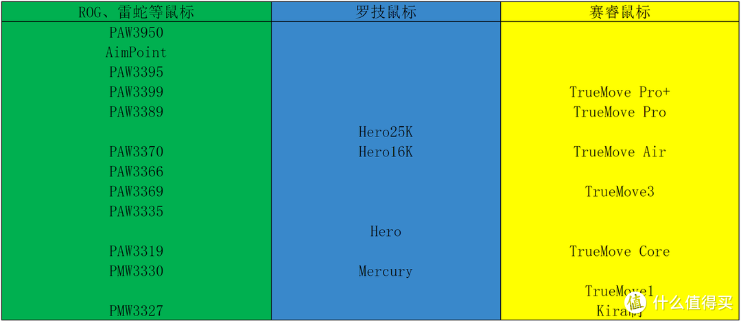 可以看到,PAW3395 处于一个非常靠前的位置,实际上,PAW3395 是目前最顶级的公版传感器(公版即所有厂家都可以采购),除了雷蛇独占的 PAW3950 外当属 PAW3395 最强(AimPoint 为 ROG 基于 PAW3395 定制),领先许多人熟知的罗技旗舰级鼠标 GPW 所搭载的 Hero25K 至少 1 代以上,更别提罗技入门级鼠标 G304 所搭载的 Hero、雷蛇入门级鼠标小巴蛇所搭载的 PAW3369 等等。