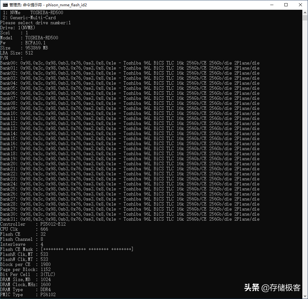 俄罗斯人Ochkin Vadim编写的Flash ID工具能实现固态硬盘硬件方案的精准识别。Flash ID根据固态硬盘主控品牌和接口类型分成多个版本。东芝RD500可以通过phison_nvme_flash_id工具识别到其所用的闪存信息,包括堆叠层数96层、TLC类型、256Gb/die、2 Plane设计。
