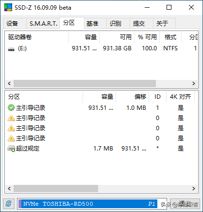 CPU-Z、GPU-Z是大家耳熟能详的CPU和显卡检测工具,但是SSD-Z恐怕要让人失望了,检测效果很不理想。下图是东芝RD500检测结果,主控、闪存和接口等信心一概无法展示。