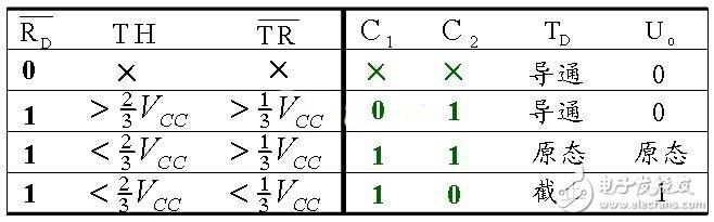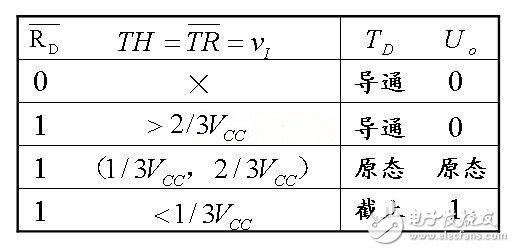 将高触发端TH和低触发端TR连接在一起,上述的555功能表变为如下功能表。