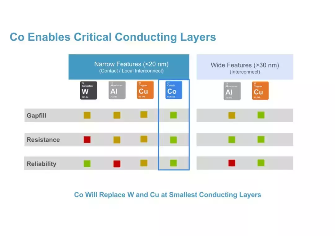 然进入 20 纳米以下高端工艺后,无论是钨、铝、铜的表现其实都不理想,相较之下,“钴”在填满能力、抗阻力、可靠度三方面是异军突起,尤其在半导体 10 /7 纳米以下的高端技术,“钴”是新一代导线材料之王。