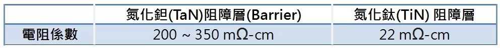 然而,此氮化钽(TaN)比氮化钛(TiN)的电阻系数大很多,相差十倍以上(参见表1),使用氮化钽(TaN)为铜的阻障层,将会有使金属连线电阻增加的风险。