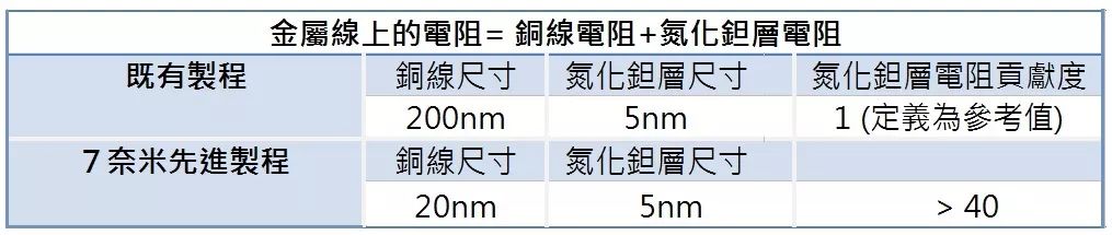 然而,在铜(Cu)制程中,因铜的容易扩散的特性关系,所以也不能藉由降低氮化钽(TaN)层的「厚度」来减少电阻,否则就会失去阻障功能。因此在7 纳米IC 制程中,使用新材料取代铜导线或阻障层变成很重要的课题。