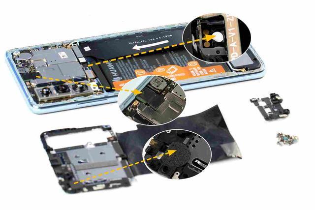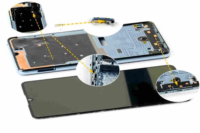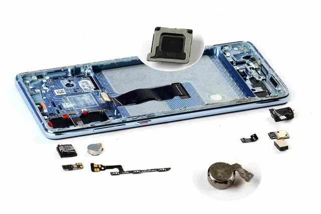 先将主、副板取下,然后断开摄像头以及扬声器的接口并将其取下。扬声器正面有一条小天线,主板上则有两处用于散热的导热硅脂。内支撑对应摄像头的位置设有用于保护的硅胶垫,而对应麦克风位置以及 USB 接口也设有泡棉垫,可见华为 P30 对于元器件以及接口的保护做得还是相当到位的。