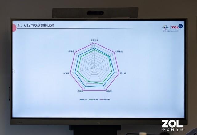 据TCL声学工程师介绍,C12的音响在极大关键特性上拥有相当出色的表现,甚至超过了友商的旗舰电视。比如平坦度±3dB,达到了专业音响的的水平;响度比友商大10dB,动态范围更广;失真度也达到了高保真的要求。在低音效果、人声表现、层次感、均衡度、声压级、失真度、临场感等多个维度,都有相当优异的表现。