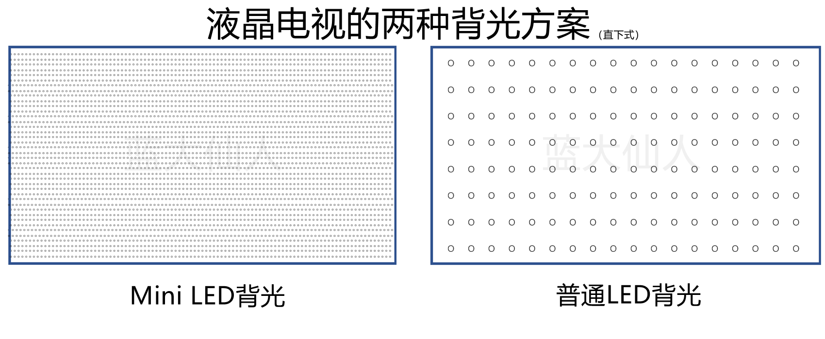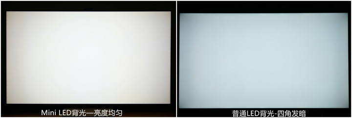 普通液晶电视,背光灯珠是比较大的,灯珠之间的间距也很大,这容易导致屏幕背光不均、四角发暗的情况,而采用微型化密集化灯珠的Mini LED背光,就可以避免这种问题的产生。