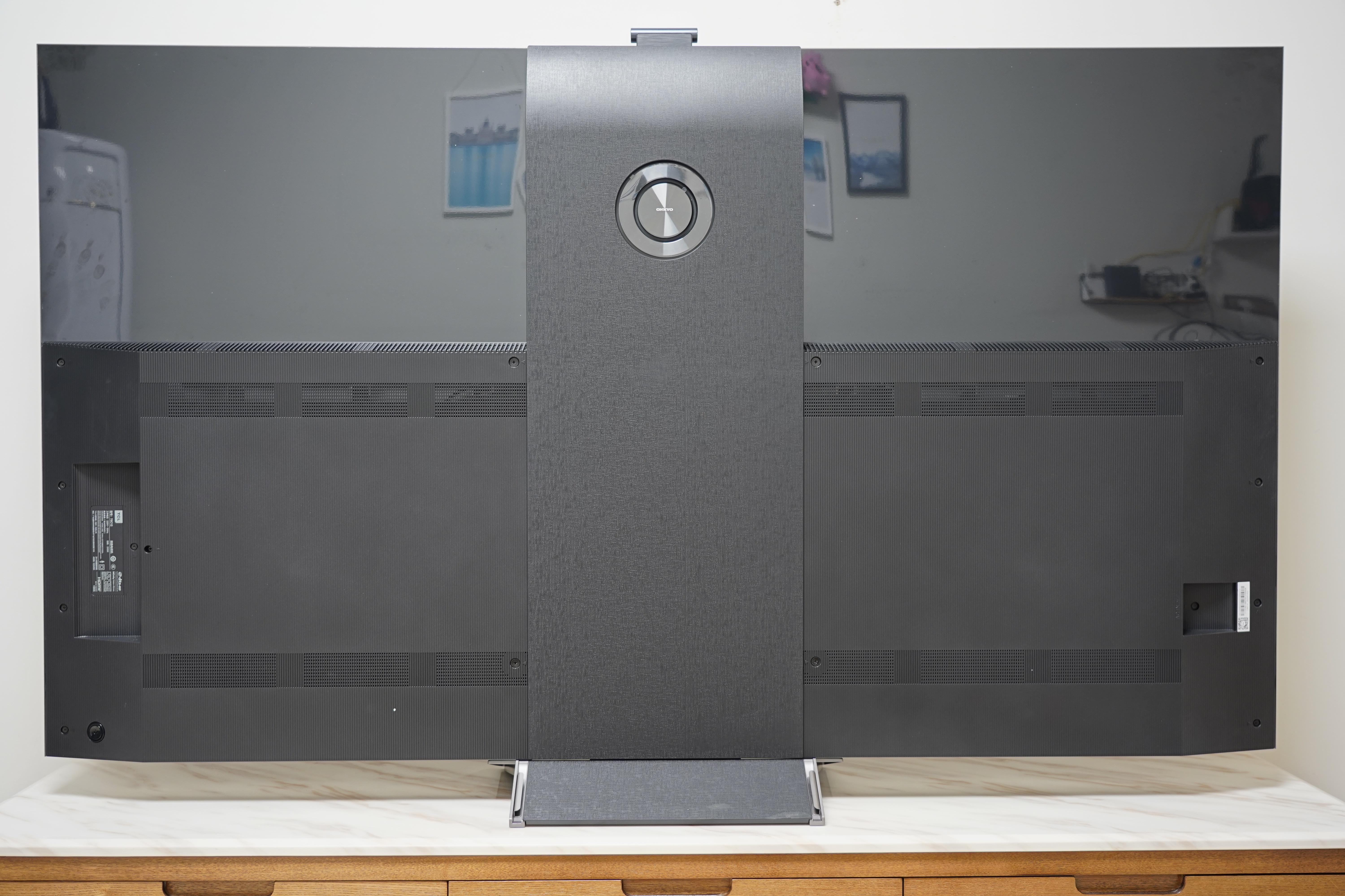 背面中间这一大块竖条,是瀑布声学柱,是为低音炮和摄像头做出的妥协,瀑布声学柱一来可以增大音响共鸣,置于中上方的音响低音更容易从电视顶部释放出来。二来相比传统内置在小后壳里面的低音炮拥有更大的音响振动空间,减少低音失真让声音更加饱满。