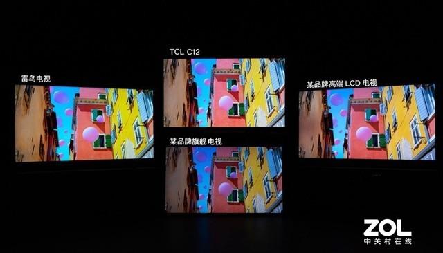 注:上方的是TCLC12 Mini LED 智屏,左侧是雷鸟电视,右侧是某品牌高端LCD电视,下方是某品牌旗舰电视(接入相同的信号源)。