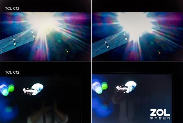 首先来看一下MiniLED的24万级精准控光。高强度明暗差画面,相机很难表现出来,所以我们通过过曝的方式,来展现高亮部周围的光晕情况。可以看到C12对黑色部分的抑制已经达到了OLED电视的水准,更多的背光分区实现了更理想控光效果。