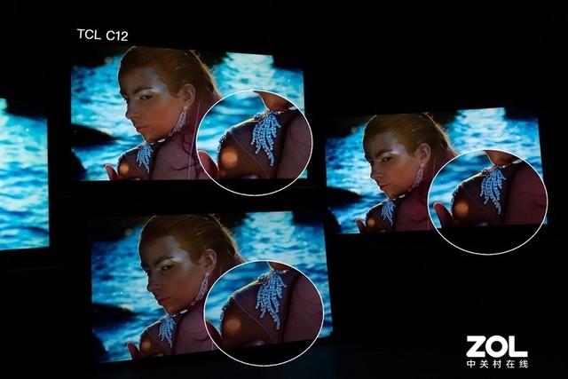 这组大逆光场景看看C12暗部细节的表现。画面左下角女生肩膀上的白色吊带,LCD电视几乎已经不可见,而C12是三台电视中最为清晰的。此外C12凭借高动态范围,将肩膀上金属挂饰表现得相当具有质感。