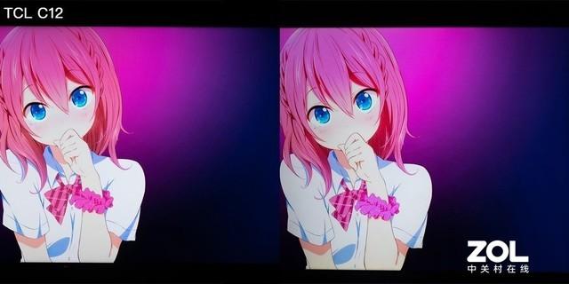 魅力珑调色芯片不仅能消除画面锯齿,还减少纯净画面的杂色,以及优化色彩过度,减少断层感。可以从漫画人物背景来观察色彩过度的表现,C12在明暗交界线的位置过度更加柔和,没有明显的色阶断层。