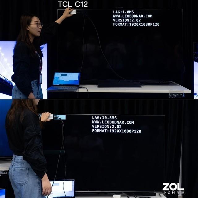 除了画质优异,TCLC12 Mini LED智屏强大的图像处理技术,让输入画面的延迟也非常小,满足了游戏用户的刚性需求。现场实际对比了C12和某高端LCD电视,在1080P、120帧下,LCD电视延迟达到了10.5ms,而C12仅为1.8ms,这样的延迟数据哪怕是射击类游戏也能轻松驾驭。