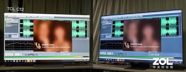 MEMC运动补偿方面,C12表现出了良好的稳定性,在主体人物与背景快速移动交错的画面中,C12画面抖动更小,补帧更及时、顺滑,而右边的LCD电视仔细看会有些许的卡顿。给实际观影带来的差异就是LCD电视播放动态画面时看久了眼睛很累,而C12就不会。