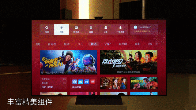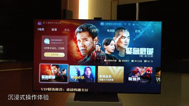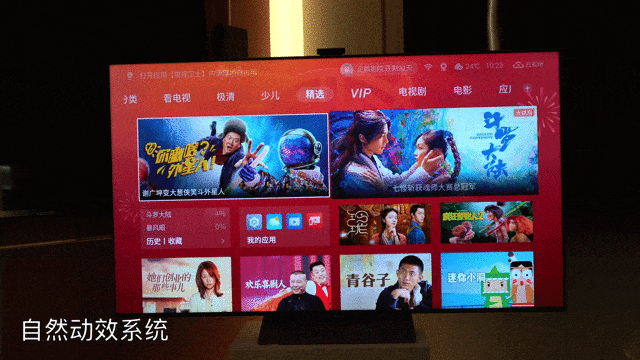 智屏系统UI5.0「沉浸式的操作体验」,将菜单内容与整个电视画面融合起来。比如在初级菜单中选中某一个影片,整个电视画面就会出现这个影片的大海报;在打开影片选剧集界面时,把电视剧的海报当做整个页面的背景,去加强用户对内容的理解。另外在背景和内容的互动上,也做了沉浸式的效果,背景会随着选择内容元素的不同而发生改变。