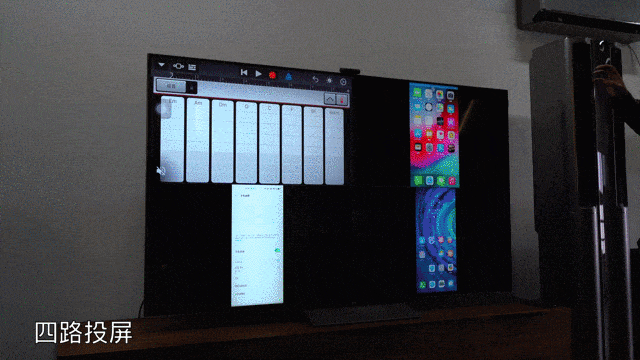 C12还有一个杀手锏级别的功能,最多支持「四路投屏」,而且兼容的市面上几乎所有智能手机。不需要单独下载APP,也不需要在TV端做任何操作,直接在手机端直接选择投屏,就可以快速投屏到TV上。除了四路投屏之外C12还做了一些深度的调整,比如可以通过菜单项设定调整某一路音频开启的模式。除了音频之外,还可以选择一块屏幕作为主屏,其他三块小屏就会自动排列在一侧作为小屏。
