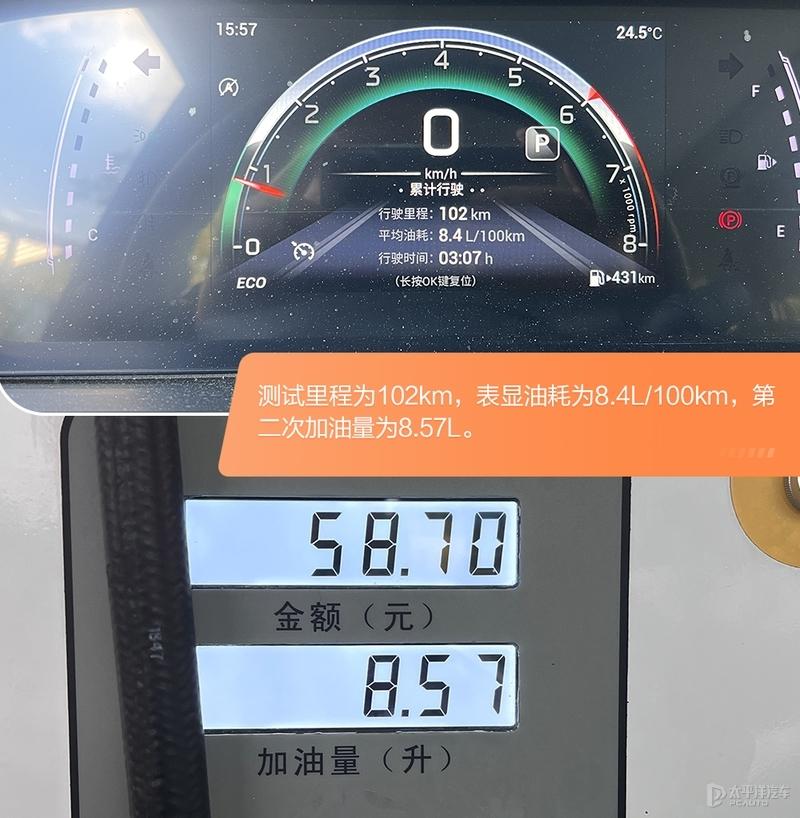 先把试驾车油量加满,然后把驾驶模式调到ECO且把小计里程清零,空调调到23℃加两格出风量。行驶里程为102km,平均时速为33km/h多左右。第二次加油量为8.57L,实测油耗成绩为8.4L/100km,和表显油耗一致。