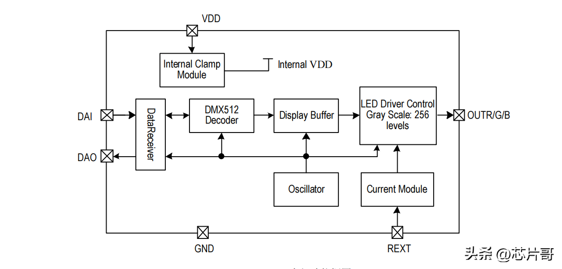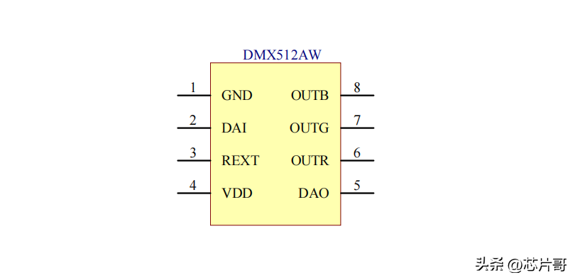 DMX512AW芯片,它是一个能同时控制RGB三色LED灯的驱动芯片,并且还是恒流驱动,驱动的电流是可以自由设置的,范围在18mA ~ 60mA。