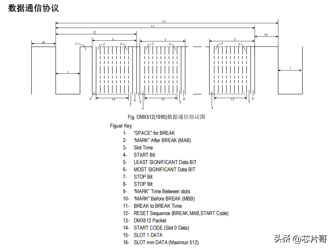 与之类似,DMX512通信协议也是一连串的数据位组成的
