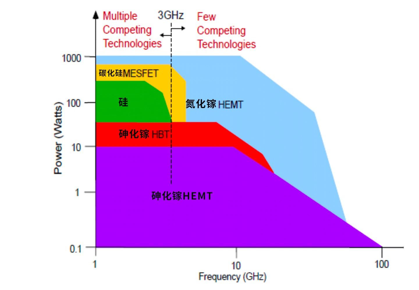 就拿功率和频率来说,第一代半导体材料的代表硅,功率在 100Wz 左右,但是频率只有大约 3GHz;第二代的代表砷化镓,功率不足 100W,但频率却能达到 100GHz。因此前两代半导体材料更多是互为补充的关系。