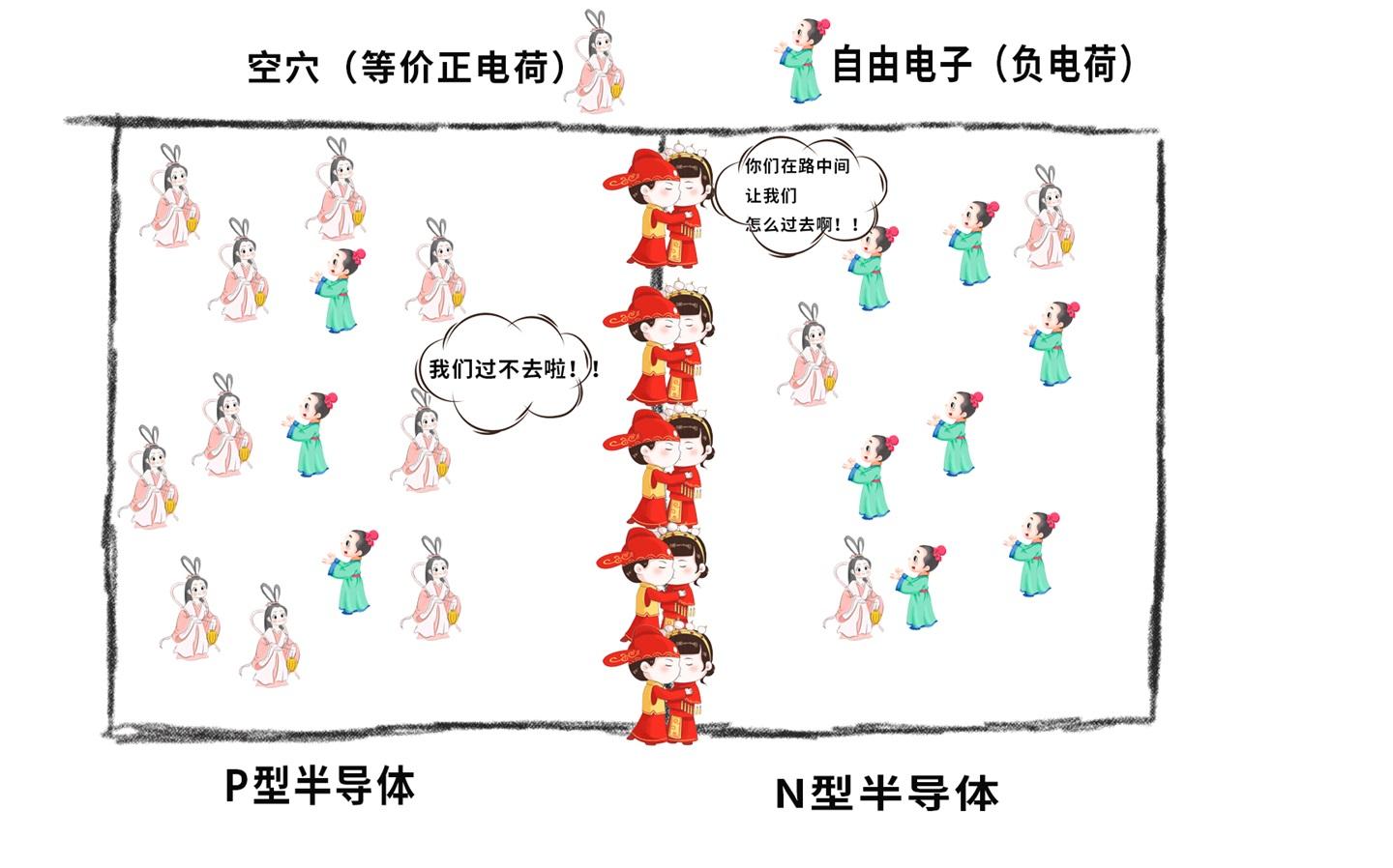 注意,这些过程和上面 “人墙”的形成是动态同步进行的,人们把这种结构叫做 “PN 结”。