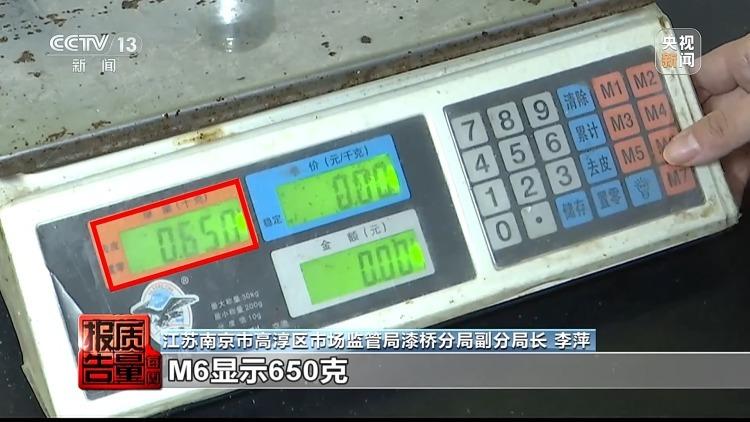 江苏南京市高淳区市场监管局漆桥分局副分局长 李萍:当时我们在这个摊位进行现场检查的时候,这个经营者是正在使用这台秤,然后把这个砝码放到秤上之后,通过按M1到M6不同的按键,显示出来的重量读数是不一样的。