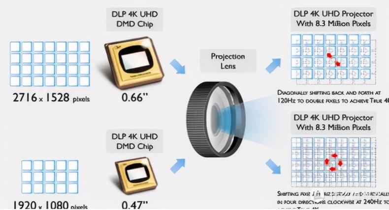 至于为什么市面上一些没有采用0.47英寸DMD芯片的投影仪也能够达到1080P的分辨率,主要得益于德州仪器(TI)的“XPR”技术。通俗地说,就是在成像过程中多次抖动DMD芯片,上面的每一个微镜多次参与成像,利用视觉暂留现象最终达成1920*1080个像素点的图像。即使一个一个像素去数,采用XPR技术的投影仪依旧可以输出1080P清晰度的像素点,所以其1080P的分辨率是真实存在的。