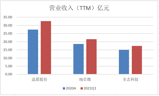 晶晨股份是三家中营业收入最高的企业 ,在2021年一季度,营业收入TTM(滚动收入)为32.64亿元,环比增长19%,也是三家企业中增速最高的。瑞芯微和全志科技在21年一季度营业收入分别为21.58亿元和17.45亿元,均增长16%。综上来看,在营业规模上晶晨股份排名最高。