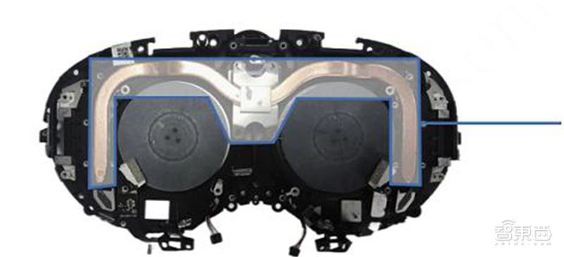 Quest Pro散热采用扁铜管,内注导热液,CPU紧贴散热铜管中部,铜管两端分布在两个风扇旁,并紧贴密合金主板支架, 热量通过风扇逐步播出到头显外。
