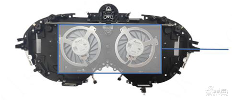 Quest Pro采用了双散热风扇设计,风扇供应商为台达电子(Delta)型号为KSB0405HB。风扇背面紧贴显示屏,可将屏幕热量排至中腔,再与导热管和合金支架的热量一起通过风扇排出头显外。
