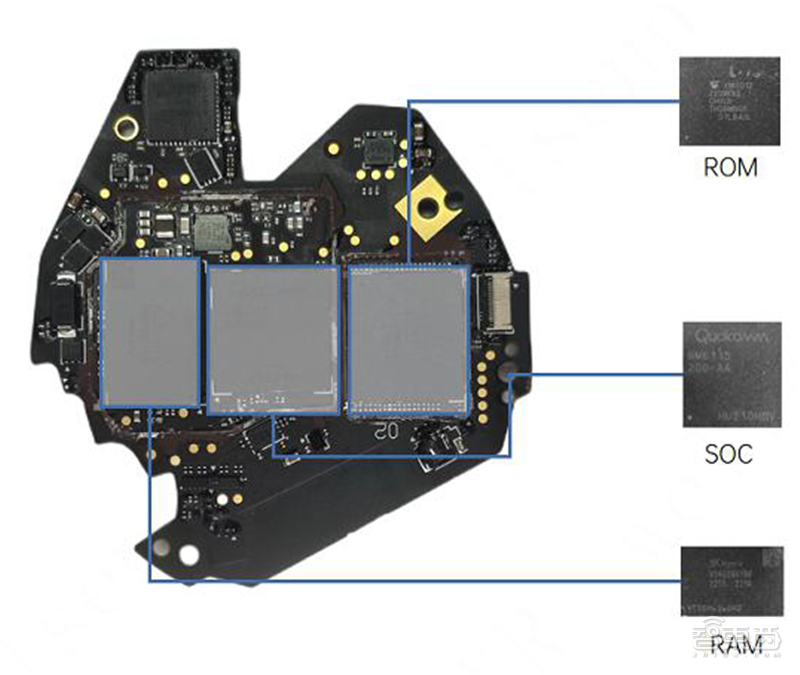 手柄主板正面最大三颗芯片是ROM、SOC和RAM,分别来自东芝、高通和海力士。
