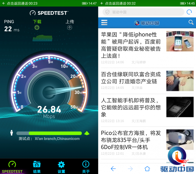 我们在一个同一运营商信号极差的地下停车场进行了简单的网络和通话测试,这时华为Mate 10的4G的网络信号衰减至-118dBm,而iPhone 8的信号已经回落到了2G网络。用华为Mate 10进行3分钟以上的通话体验,通话质量并未出现明显异常,但测试网速的确有大幅回落。而同样的场景iPhone8已经回落到了2G网络,通话质量明显变差,数据网络已经无法连接了。