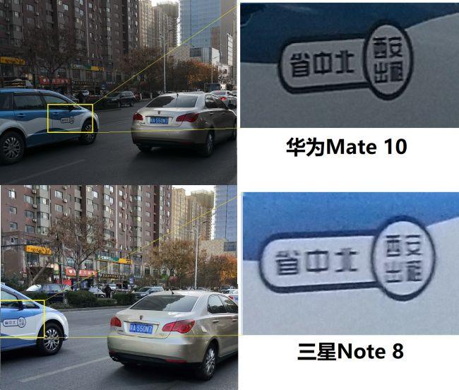 这是我们测试一组白天汽车飞驰对比场景,华为Mate 10拍摄到的画面里汽车上的字迹比三星Note 8清晰。