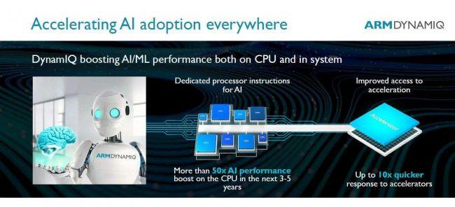 据ARM官方信息显示,针对人工智能和机器学习的全新处理器指令集在采用DynamIQ技术的Cortex-A75处理器在优化应用后,可实现比基于现有的Cortex-A73的设备高50倍的人工智能性能,并最多可提升10倍CPU与SoC上指定硬件加速器之间的反应速度。