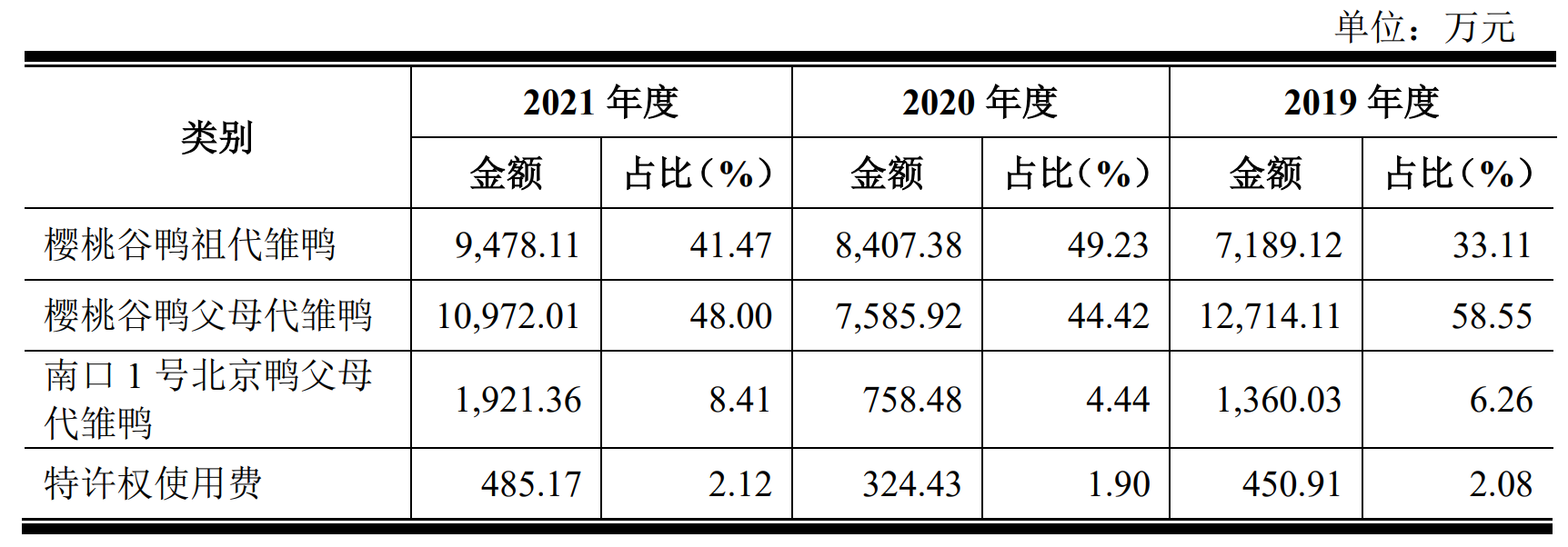 正是由于上述原因,位于育种产业链顶端的樱桃谷鸭祖代雏鸭的毛利率超过95%。2019年~2021年(以下简称报告期),樱桃谷鸭祖代雏鸭毛利率分别为96%、95.73%和96.18%。由于下游客户会采购祖代雏鸭自行养殖,樱桃谷父母代雏鸭的毛利率则明显下降且波动较大,报告期内分别为63.7%、23.72%、28.36%。