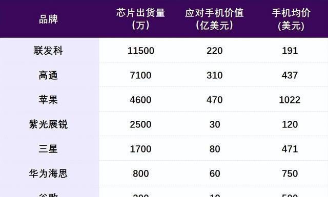 令人欣喜的是,华为海思芯片紧随其后,其800万片出货量对应手机价值60亿美元,平均每台手机售价高达750美元,彰显了其在高端市场的影响力。