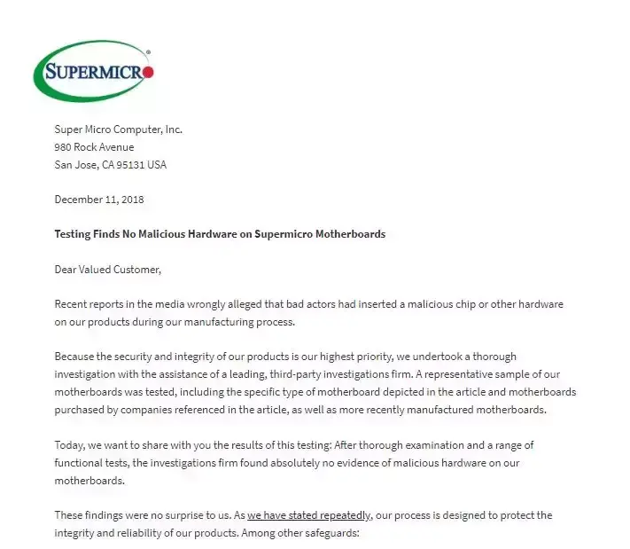 12 月 11 日,美国超微公司(Super Micro)向其客户发送了一封公开信宣布:外部调查团队在经过调查后,未发现有任何证据能证明公司以往生产的主板中存在恶意硬件。