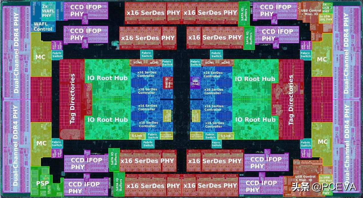 从第三代锐龙开始,AMD CPU全面转向台积电代工,但其中依然有Global Foundries代工的部分:IO die(IOD)芯片。这个相比计算芯片面积更大的家伙承担着CPU的数据输入输出功能,集成有DDR4内存控制器、PCIE 4.0控制器以及USB和SATA控制器。