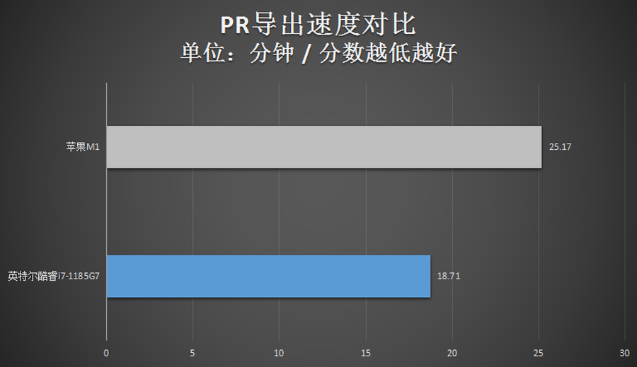 导出一段1080p画质、60帧/秒帧速率、长度达11分钟的H.264编码的视频。最终,苹果M1要比英特尔酷睿i7-1185G7慢了不少。