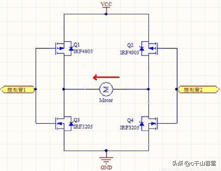 正因为这个特点,在连接好上图电路后,控制臂1置高电平(U=VCC)、控制臂2置低电平(U=0)时,Q1、Q4关闭,Q2、Q3导通。