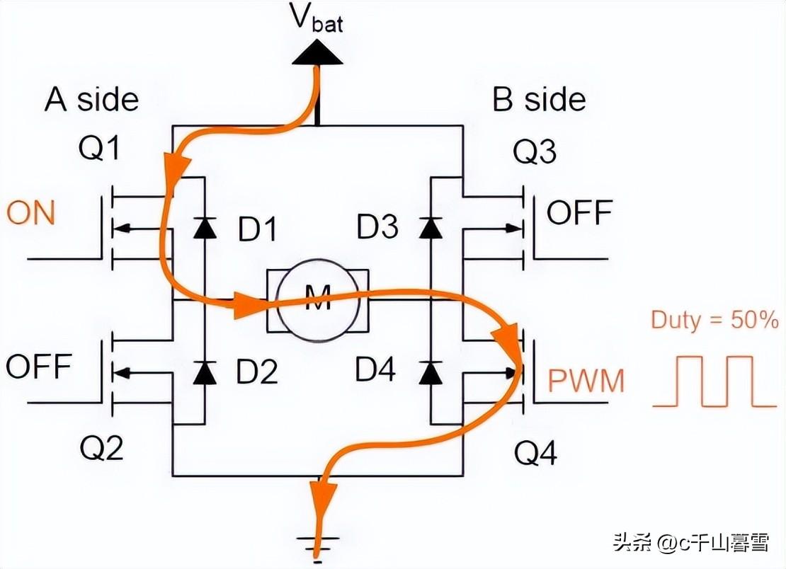 关闭Q2和Q3打开Q1 ,Q4上给它输入50%占空比的PWM波形这样就达到了降低转速的效果,如果需要增加转速,则将输入PWM的占空比设置为100%,电流方向如下图中红色线条所示。