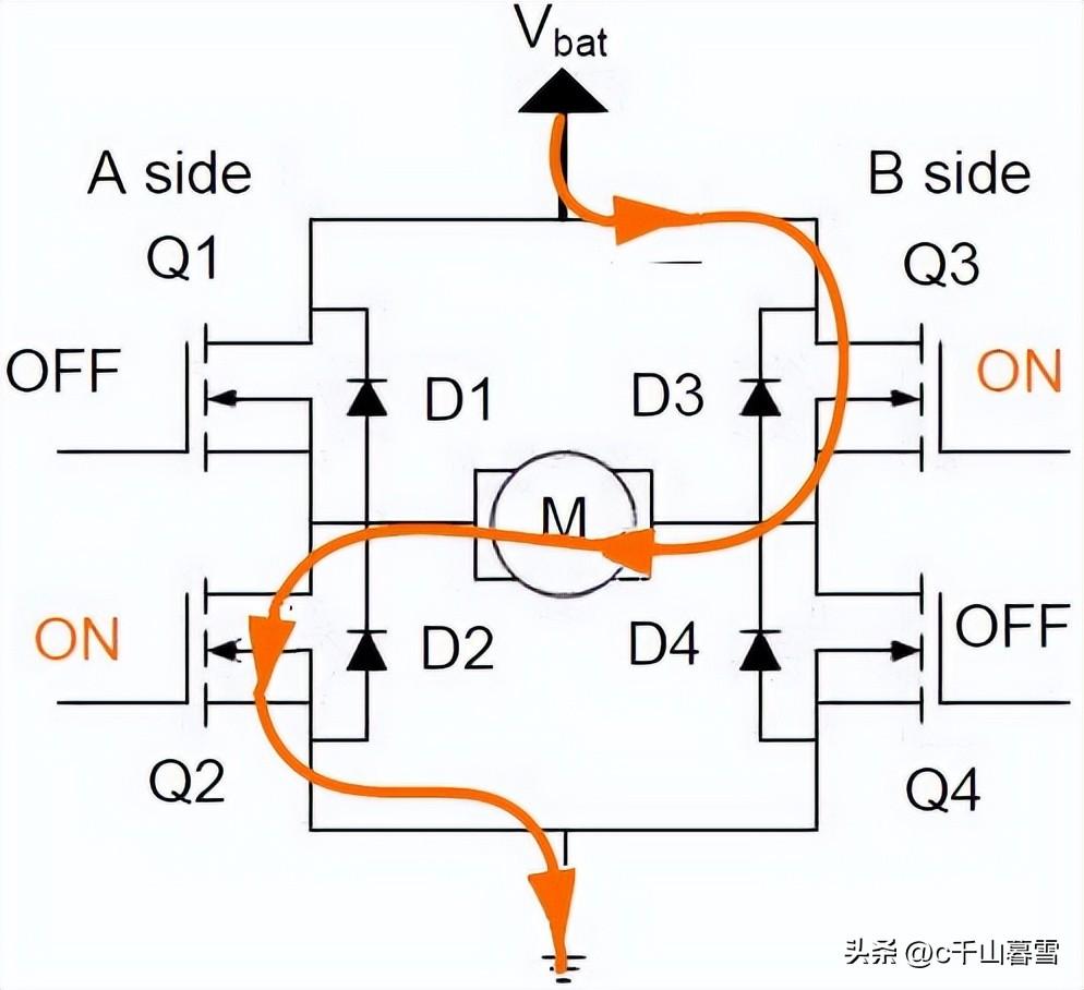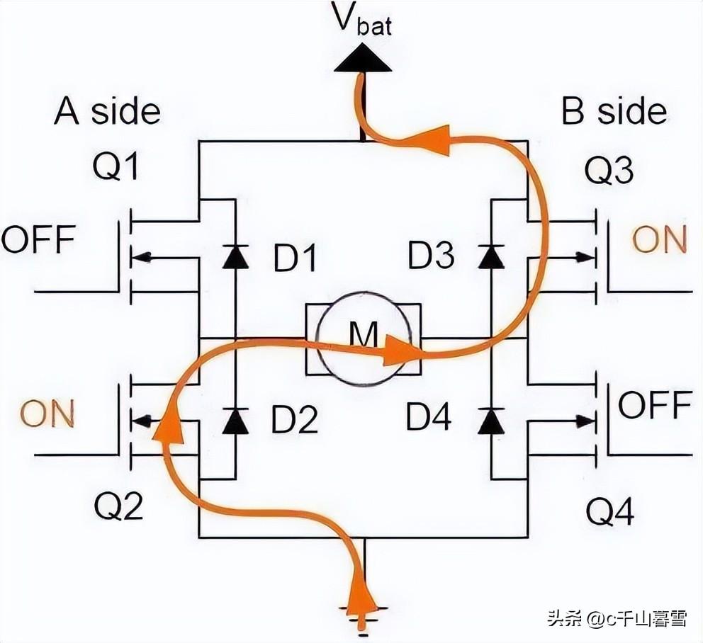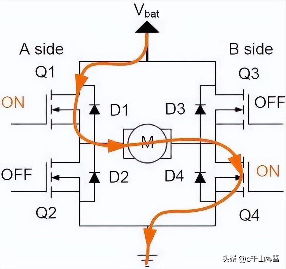 打开Q1和Q4关闭Q2和Q3此时假设电机正转,电流依次经过Q1、M、Q4 ,如下图中红色线条所示。