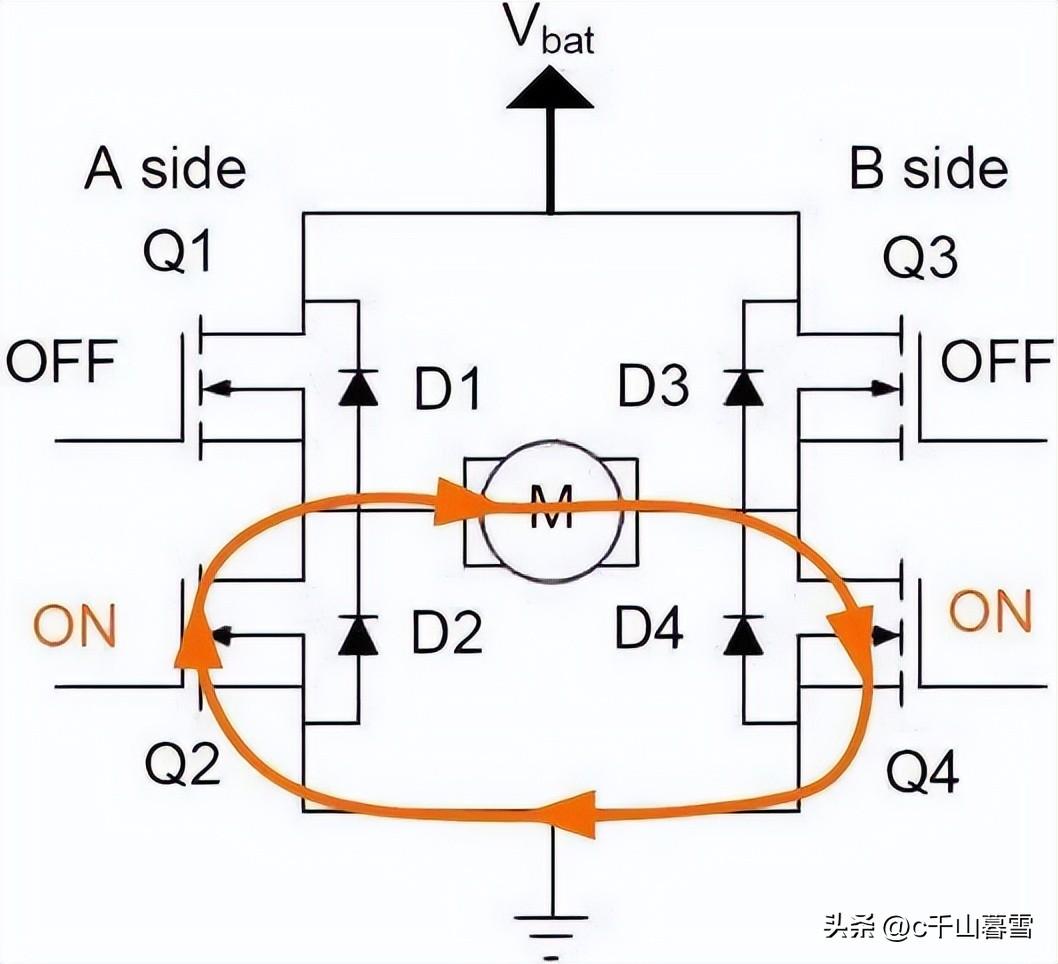 准备停止的时候,关闭Q1、打开Q2,这时候电流并不会衰减地很快,电流循环在Q2、M、Q4之间流动,通过MOS-FET的内阻将电能消耗掉。