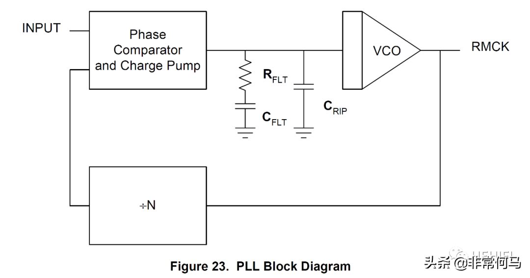 常规芯片跟踪音频时钟的方式是使用PLL(锁相环)技术。下图所示,是一个典型的PLL电路原理图。PLL实质是一个反馈电路,用来跟踪输入信号的时钟和变化。