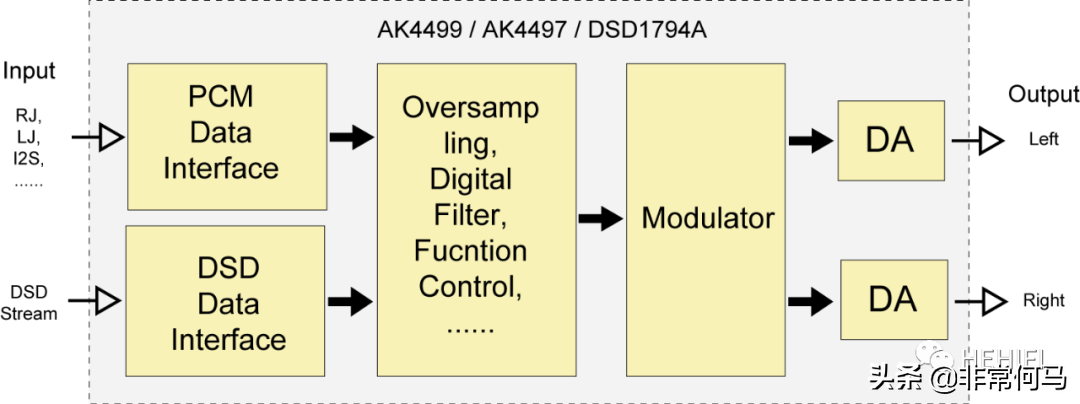 音频DAC芯片最基本的功能部件,是一个多路转换器接收各种格式的音频信号(DSD或PCM)、过采样和数字滤波器、调制器和数模转换输出等。AKM公司的AK4499、AK4497和Texas Instruments公司DSD1794等芯片就是采用这样的构成的,如下图所示: