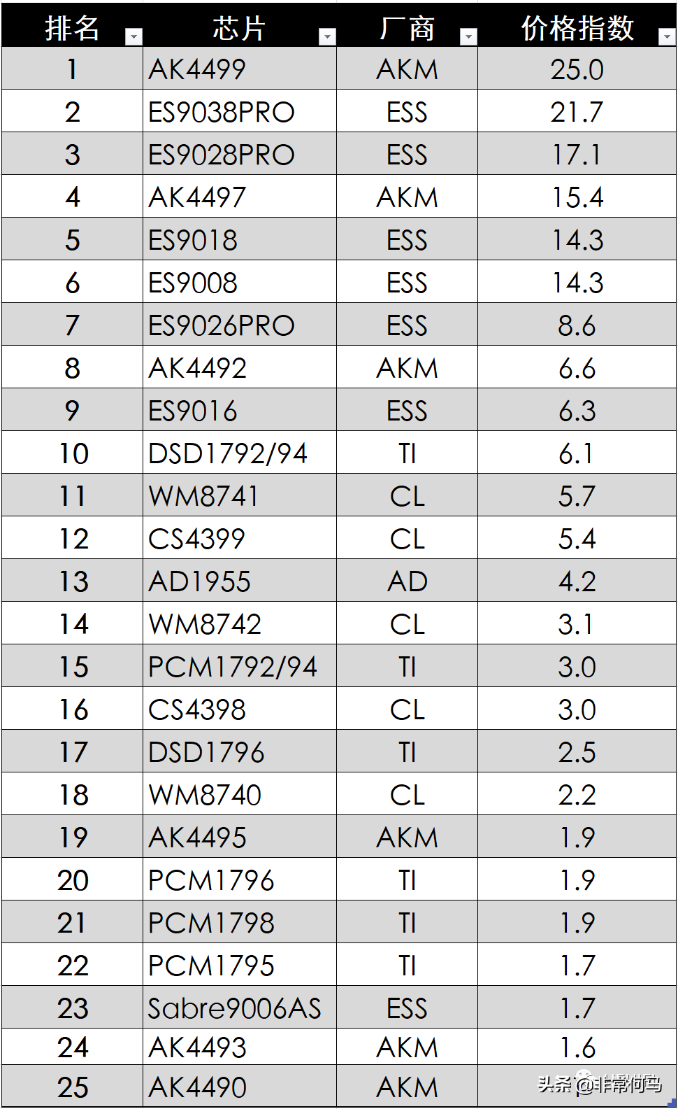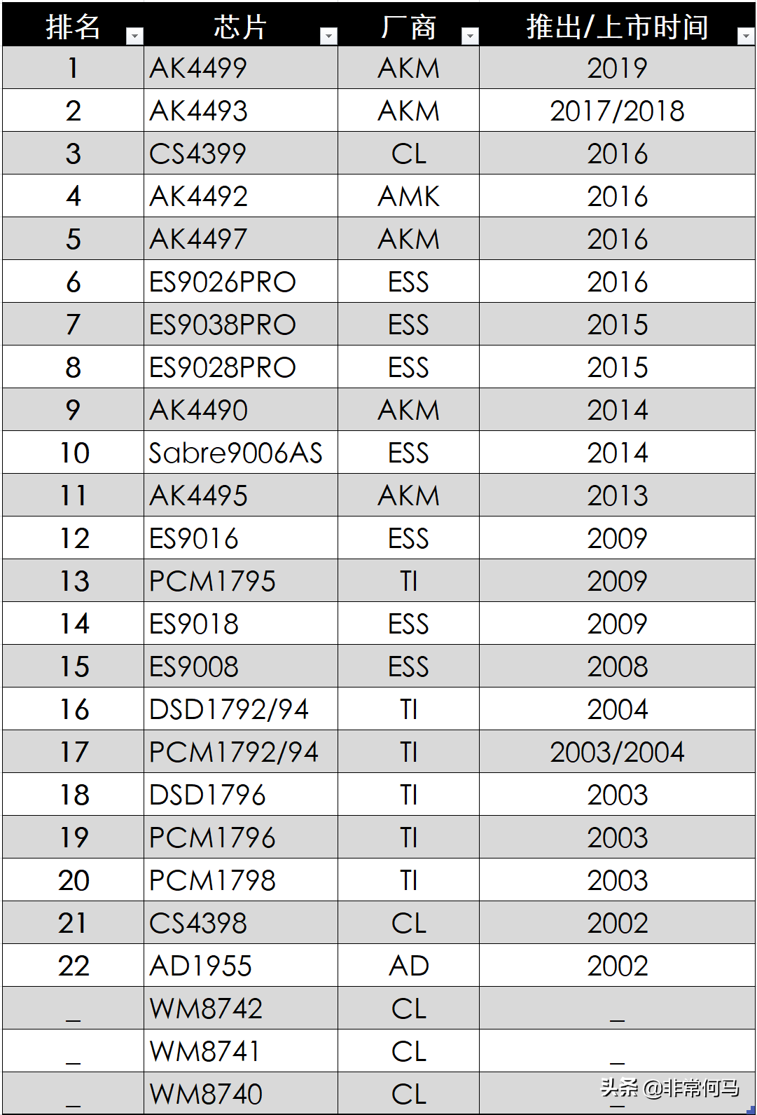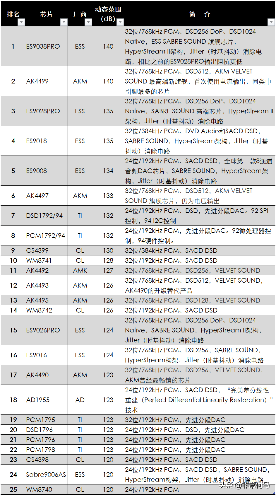 ESS和AKM公司的芯片的推出时间较晚、技术较新,有较明显的优势。排名先后不等同于声音的优劣,而且,每个人对声音的评判会有自己的理解和标准。任何一款优秀的芯片都有可能带来激动人心的好声音;同样,任何一款优秀的芯片,也都可能会受整机中其它部件的限制而发挥不出应有的性能,就比如120dB的动态范围的来说,外围电路要能够实现这个性能也不是容易的。高端音频DAC解码芯片技术复杂、种类繁多,遗漏和差错在所难免,欢迎指正、补充。